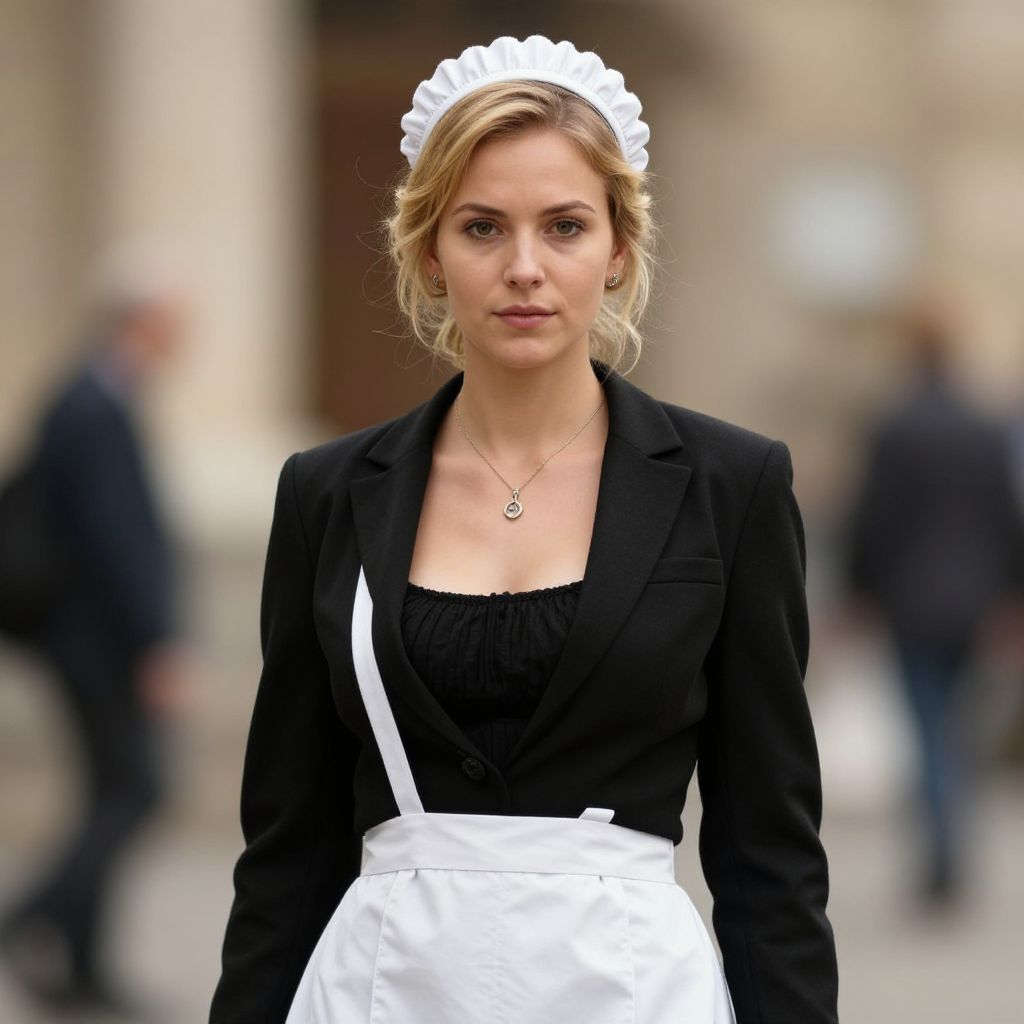 Photograph of a blonde woman with wavy hair, wearing a white maid's headband, black blazer, and white apron over a black, square-necked top. She has a subtle, neutral expression and is wearing small, silver earrings and a delicate necklace. The background is blurred, with indistinct figures and a beige building, suggesting an urban street setting. The contrast between her black top and white apron creates a striking visual. The overall style is modern, with a focus on her poised, elegant appearance.