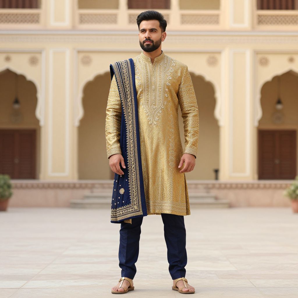 A handsome man with a neatly trimmed beard, wearing an elaborate gold and blue outfit complemented by a matching dupatta. He is standing confidently in front of a grand building adorned with ornate architectural decorations. The man is wearing traditional sandals.
