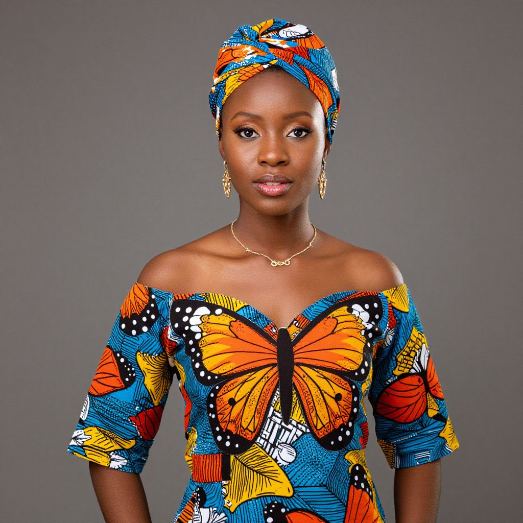 Model showcasing a vibrant Fatick African fabric ensemble featuring a matching butterfly top and headwrap, accessorized with a delicate gold necklace and earrings against a neutral backdrop.