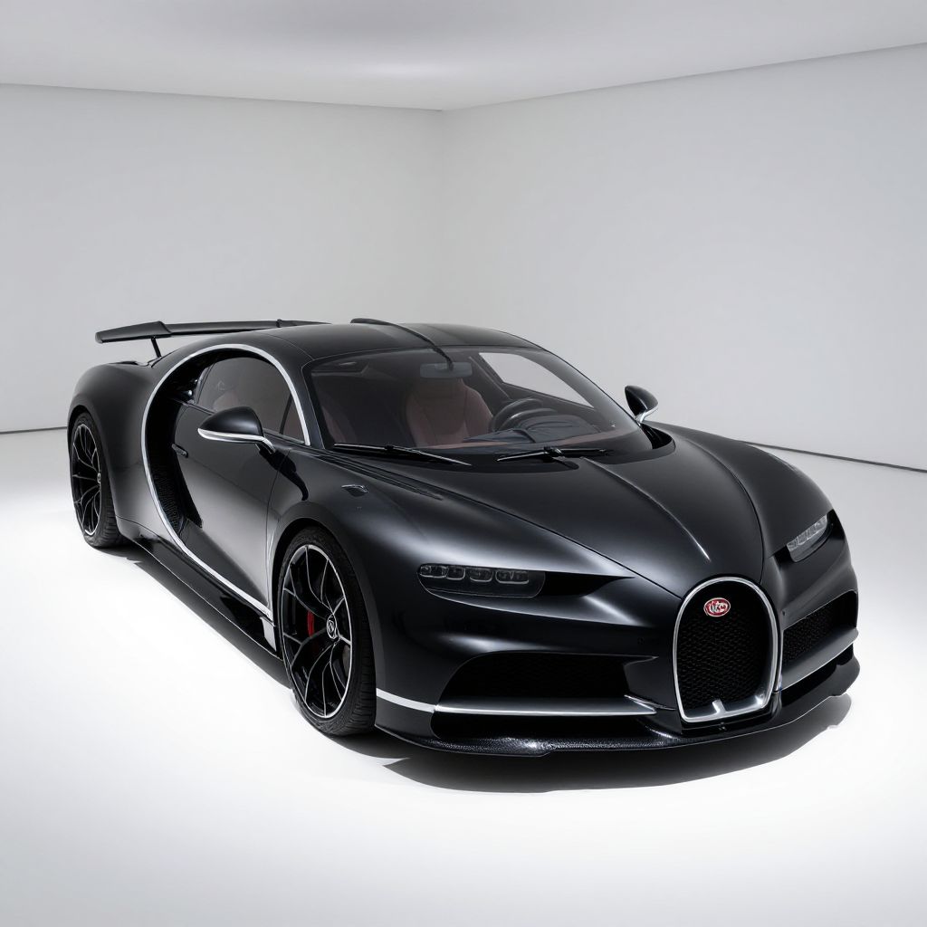 Photograph of a sleek, black, high-performance sports car with glossy finish, large black wheels, and futuristic design, set against a bright white,