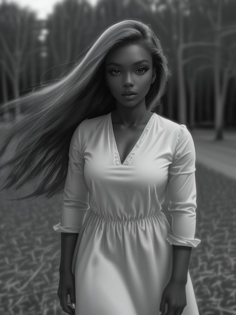 Photorealistic image of a dark-skinned woman with medium-length dark hair and brown eyes wearing a white dress with intricate lace details and long sheer sleeves. She is adorned with elegant silver earrings and standing outdoors near a calm lake, surrounded by a blurred forest background during daytime with soft natural light and bokeh effects.