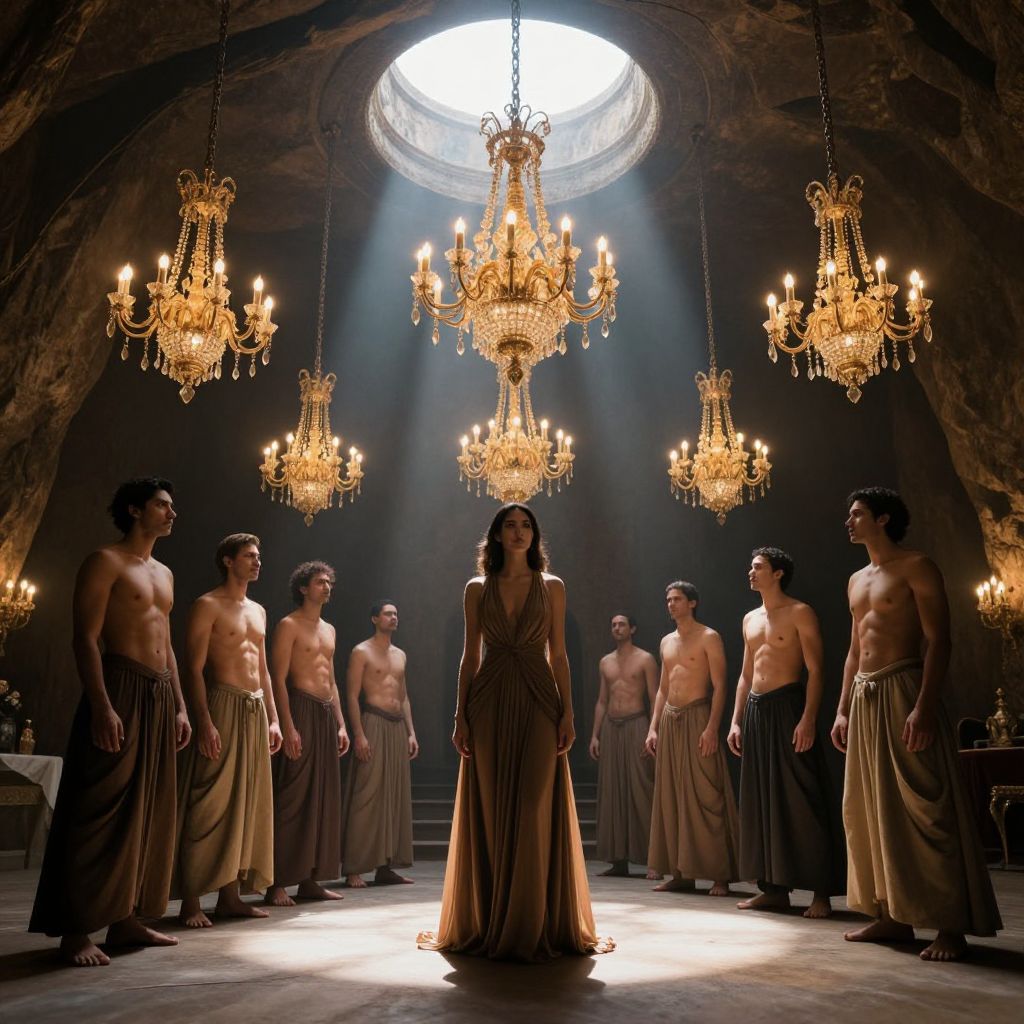 Photograph of a dramatic scene in a dimly lit, cavernous room with ornate, golden chandeliers hanging from the arched ceiling. At the center, a lone woman with long dark hair, dressed in a flowing, floor-length, beige gown, stands illuminated by a beam of light from a circular skylight above. Surrounding her are nine shirtless men, all with varying builds, wearing beige, pleated skirts, standing in a semi-circle. The men's skin tones range from fair to medium. The room's dark, stone walls and polished wooden floor add a historical, almost ancient ambiance. The chandeliers' warm light contrasts with the cool, blue-tinted light from the skylight, creating a dramatic, almost mystical atmosphere.