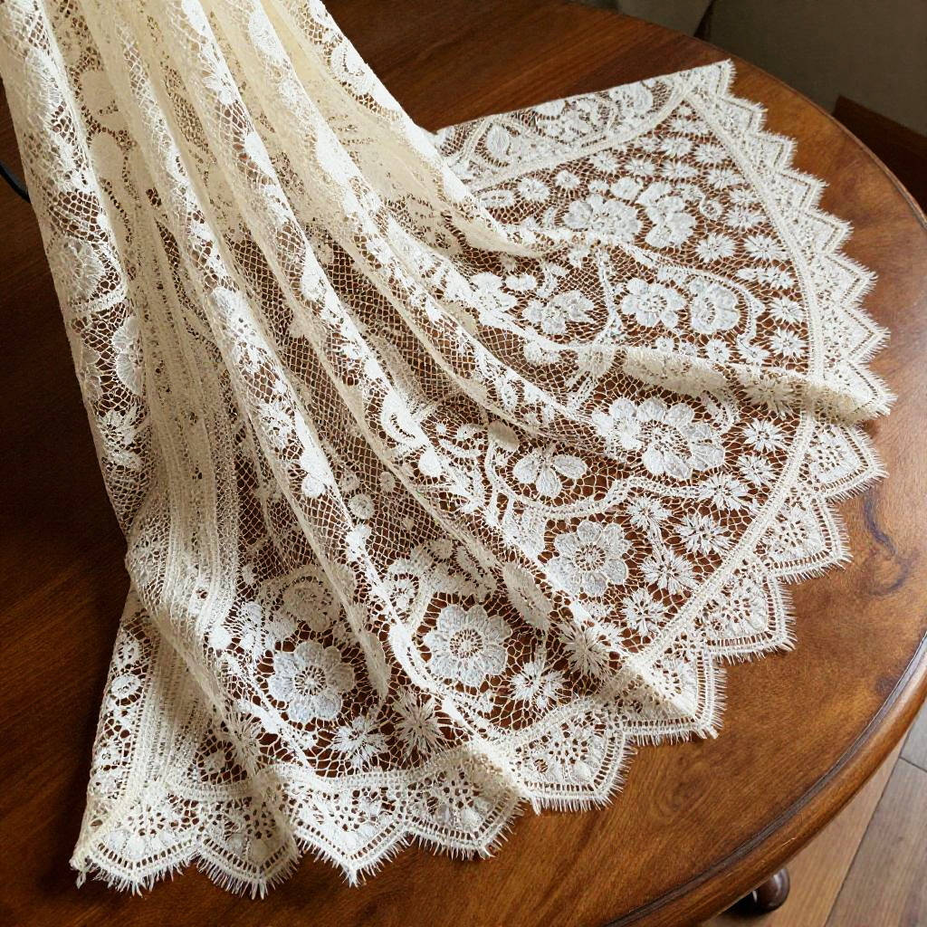 Photograph of a delicate, cream-colored lace fabric with intricate floral patterns, draping over a round wooden table. Sunlight highlights lace details.