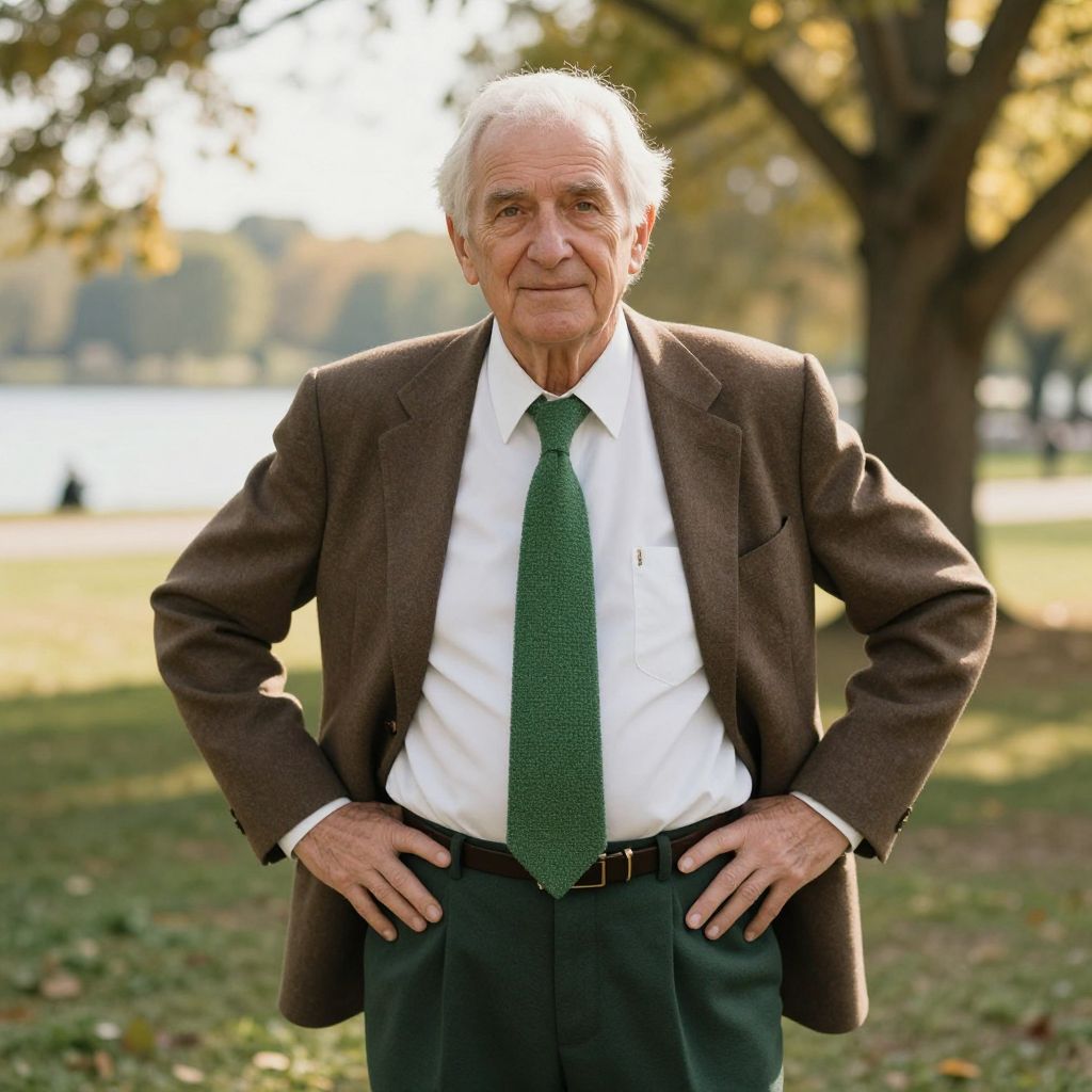 An elderly man with white hair, kind eyes, and a gentle expression, wearing a well-fitted brown suit with a crisp white shirt and a green wool tie, paired with dark green pants. He stands confidently in a sunny park, hands resting casually on his hips, with a warm, thoughtful gaze directed slightly toward the viewer. The background features a serene landscape of trees and a distant lake, with soft golden light filtering through the leaves, creating a peaceful and nostalgic atmosphere.