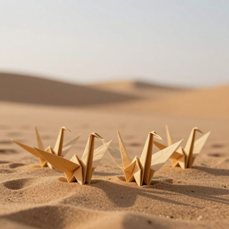 In a serene desert landscape, delicate origami cranes crafted from sand stand in perfect formation, their intricate folds shimmering under the golden light as if brought to life by the whispering winds.