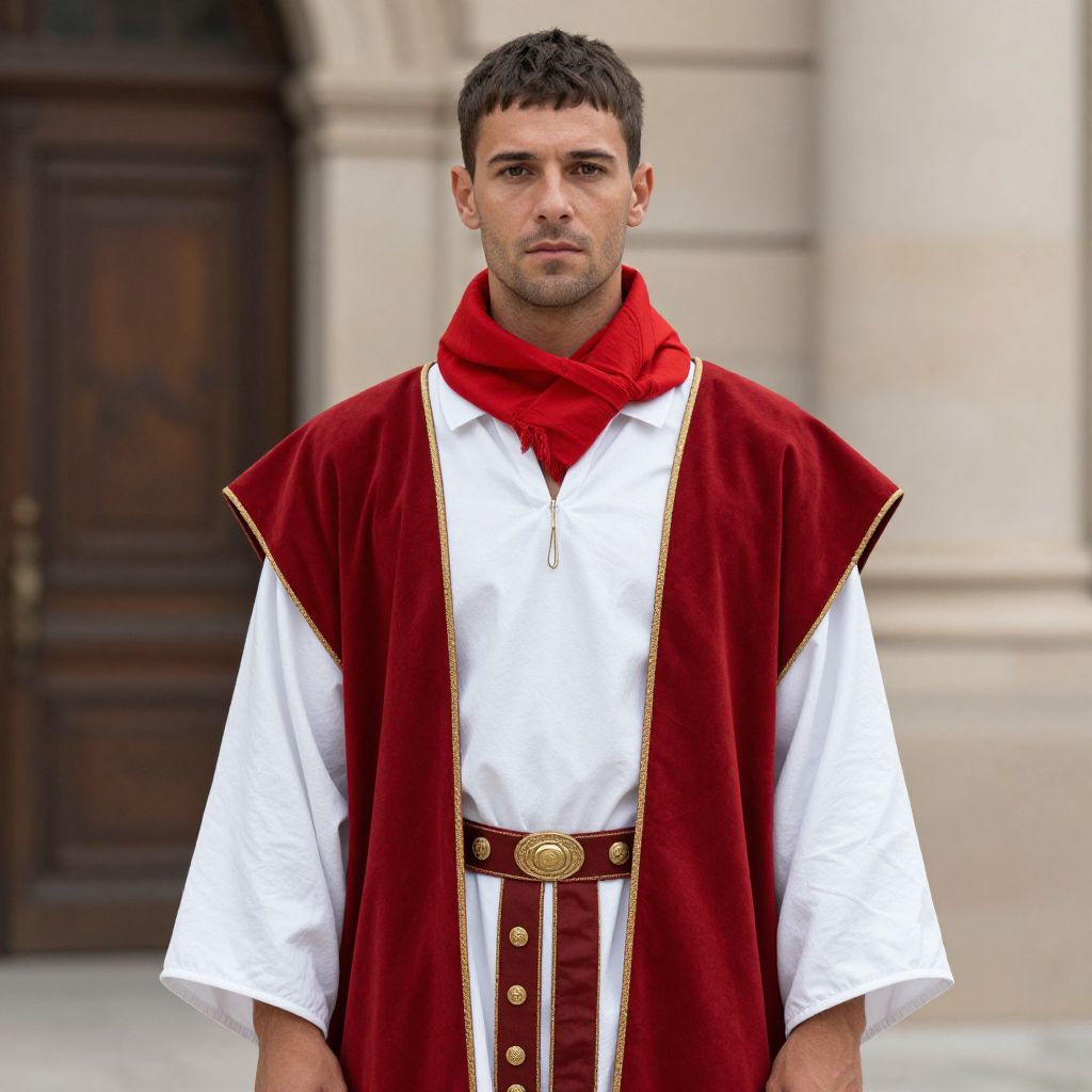 Roman Costume Man, man in a red and white robe and a red scarf