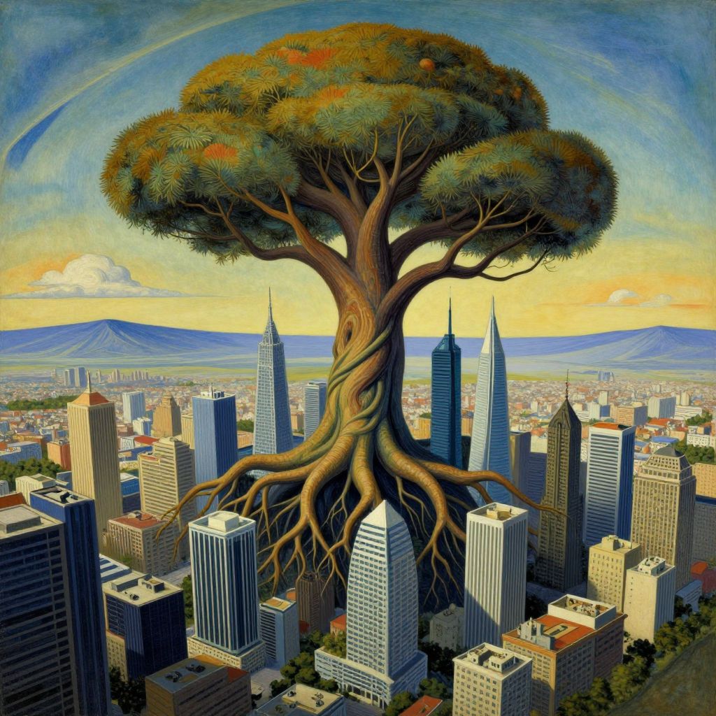 Envision a dreamlike tableau reminiscent of Magritte's iconic works, where an arboreal giant with luminescent and otherworldly fruit casts its shadow over a tranquil pond. The water's surface mirrors not only the tree's sprawling limbs but also a distant cityscape, viewed from an unusual perspective that defies conventional vantage points. This enigmatic scene juxtaposes the serene stillness of nature against the vibrant pulse of urban life, creating a thought-provoking tableau that invites contemplation on the intricate bond between the natural world and human civilization.