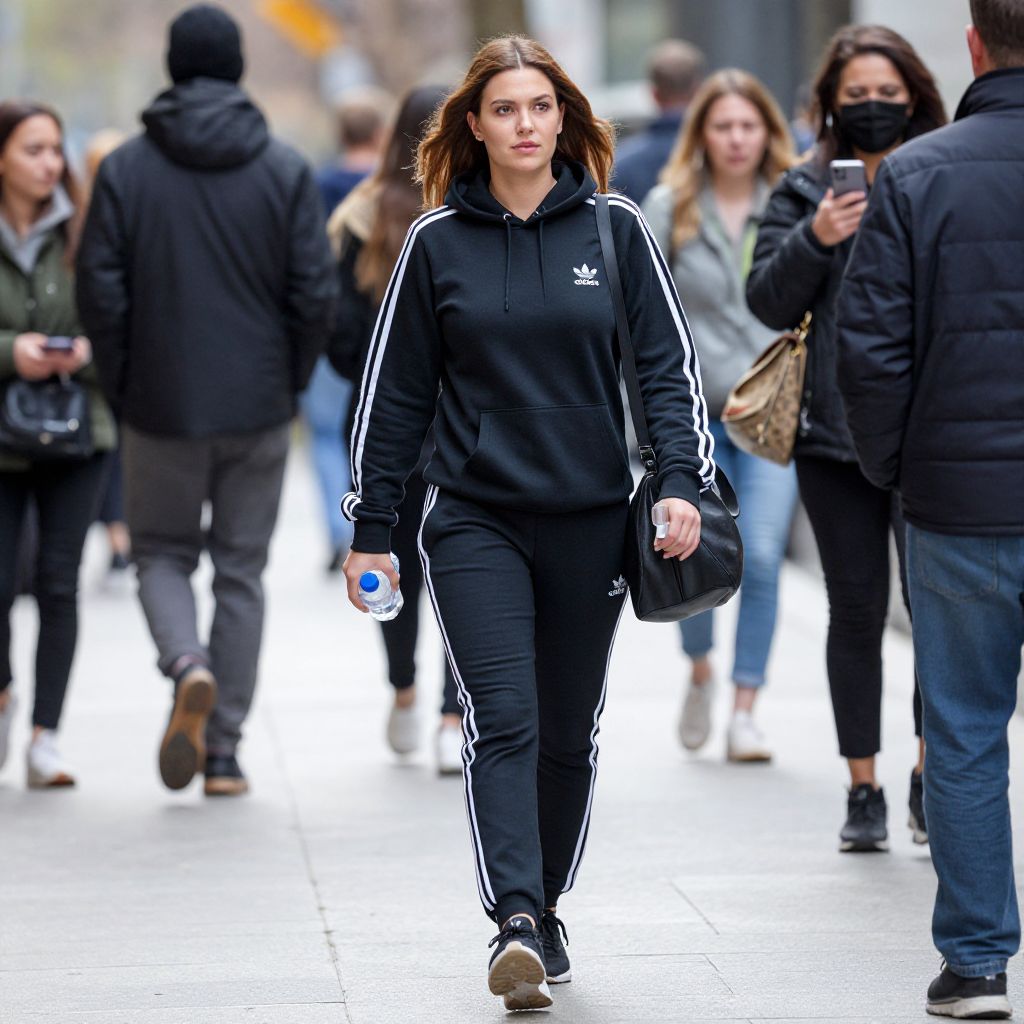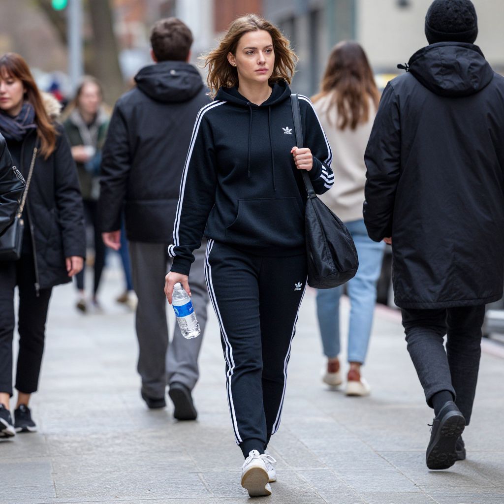 Woman walking confidently down a city street wearing a black Adidas hoodie and matching tracksuit, carrying a water bottle and a black shoulder bag, surrounded by pedestrians in various attire.