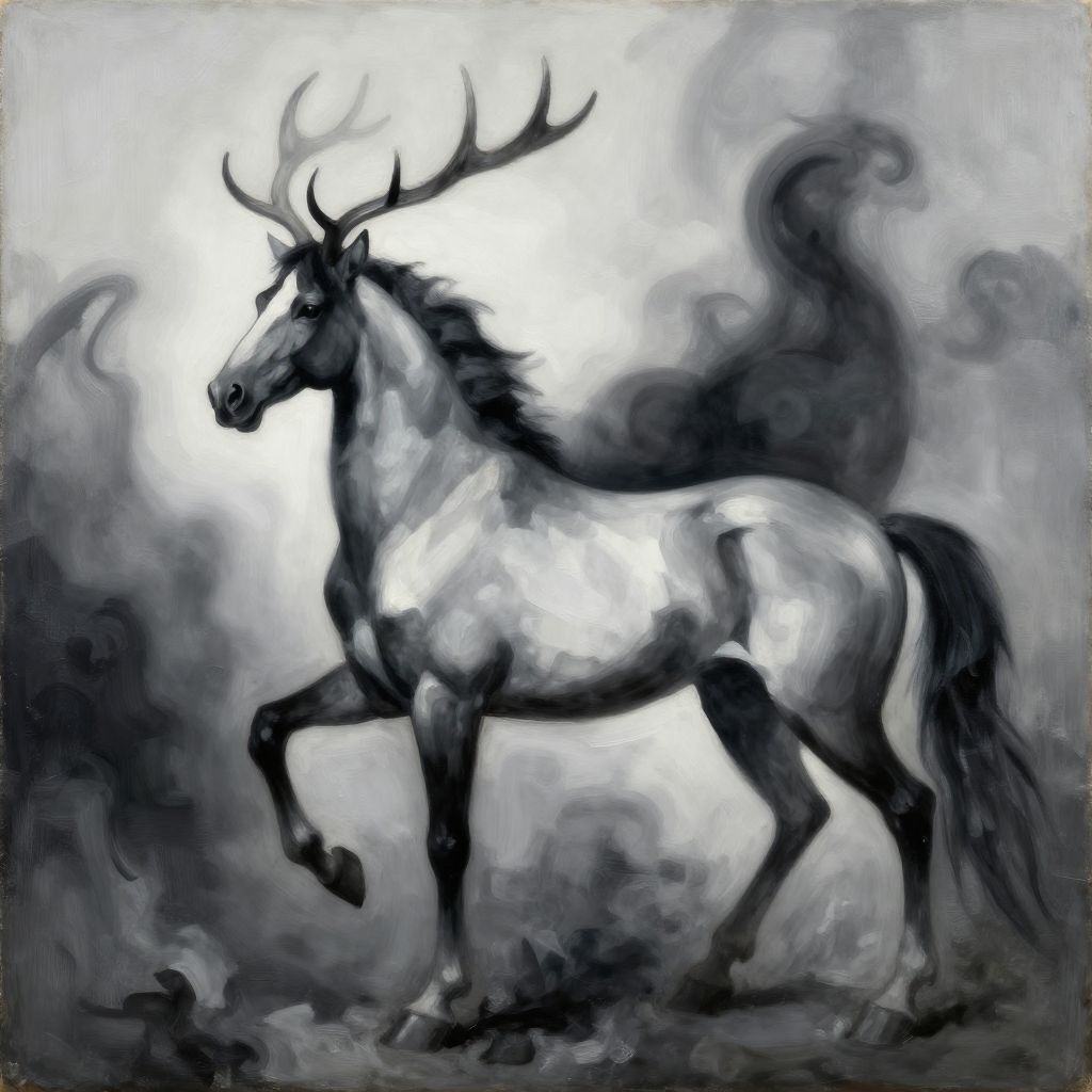 A surrealistic monochromatic oil painting depicting a mythical creature with the body of a horse and stag-like antlers. The artwork features flowing, abstract forms and shadowy, swirling figures rendered in shades of black, white, and gray. Styled in Scandinavian contemporary art, this hyper-realistic piece combines luxury with a haunting visual effect.