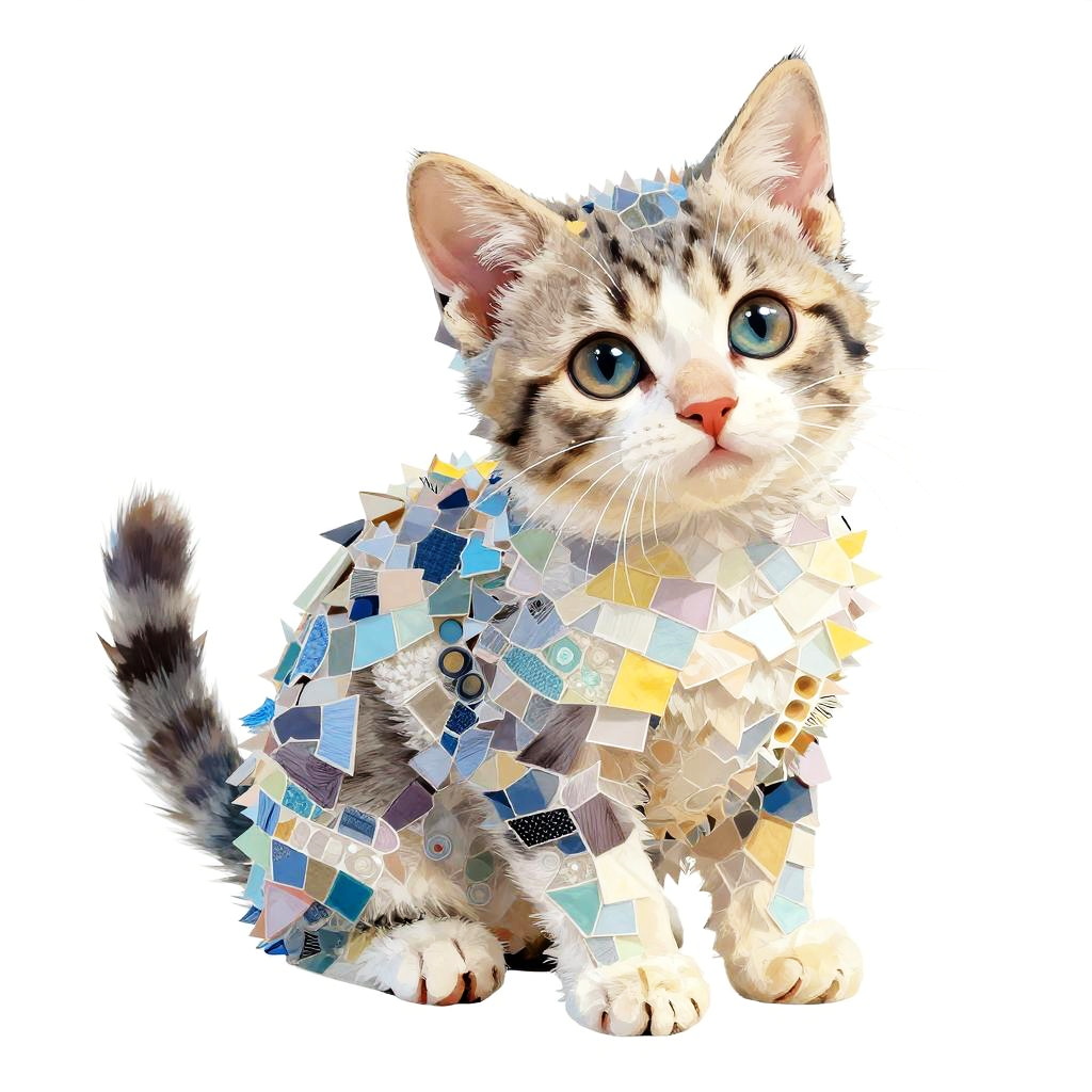 A detailed digital artwork featuring a graceful kitten composed of a mosaic of small, colorful fabric patches that form a fragmented, pixelated effect. The subject is portrayed in a cute style, with carefully arranged blocks creating depth and definition. The color palette is vibrant, including shades of soft gray, white, pastel blue, pale yellow that reflect light, giving the artwork a luminous quality.