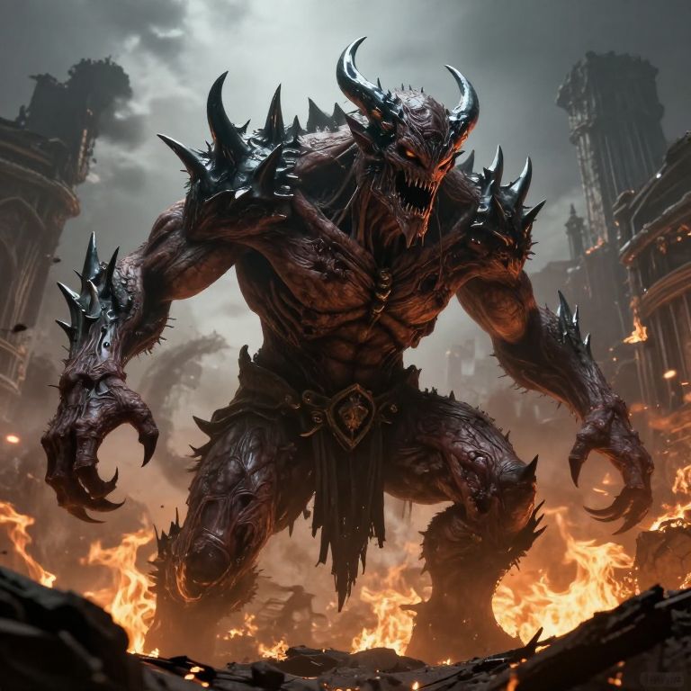 Immense, colossal demon with rotten skin and curved obsidian thorns. brutal. with bulging muscles. rampaging across the burning ruins of an ancient city. war. terror. death.