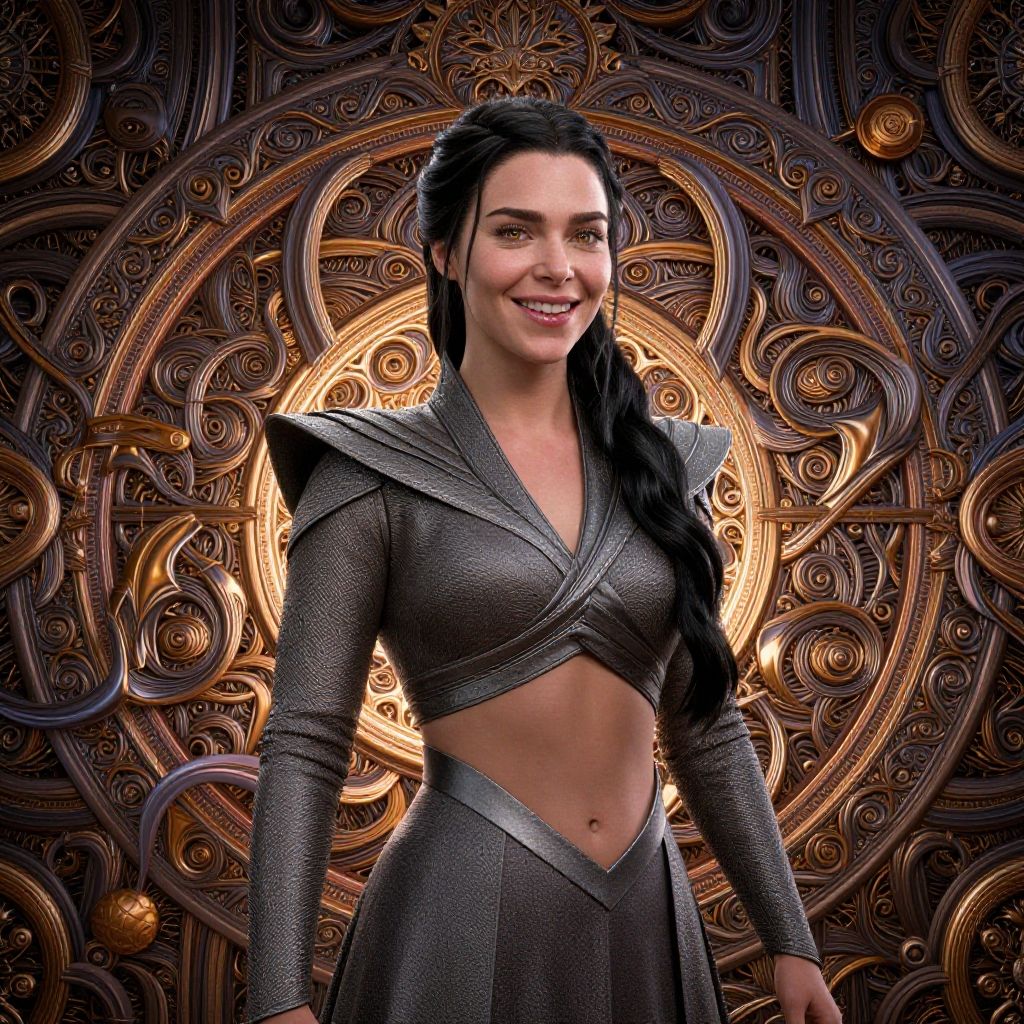 Photorealistic digital artwork of a smiling woman with long, dark braided hair, standing against an intricately designed, gold and dark brown ornate background. She wears a metallic, grey, long-sleeved, wrap-style crop top with a deep V-neck, revealing her midriff, and matching skirt. The background features symmetrical, circular, and swirling patterns, with a glowing, golden, circular centerpiece. The woman's skin is light brown, and her confident pose and warm smile exude a sense of strength and elegance. The overall style blends fantasy and sci-fi elements.