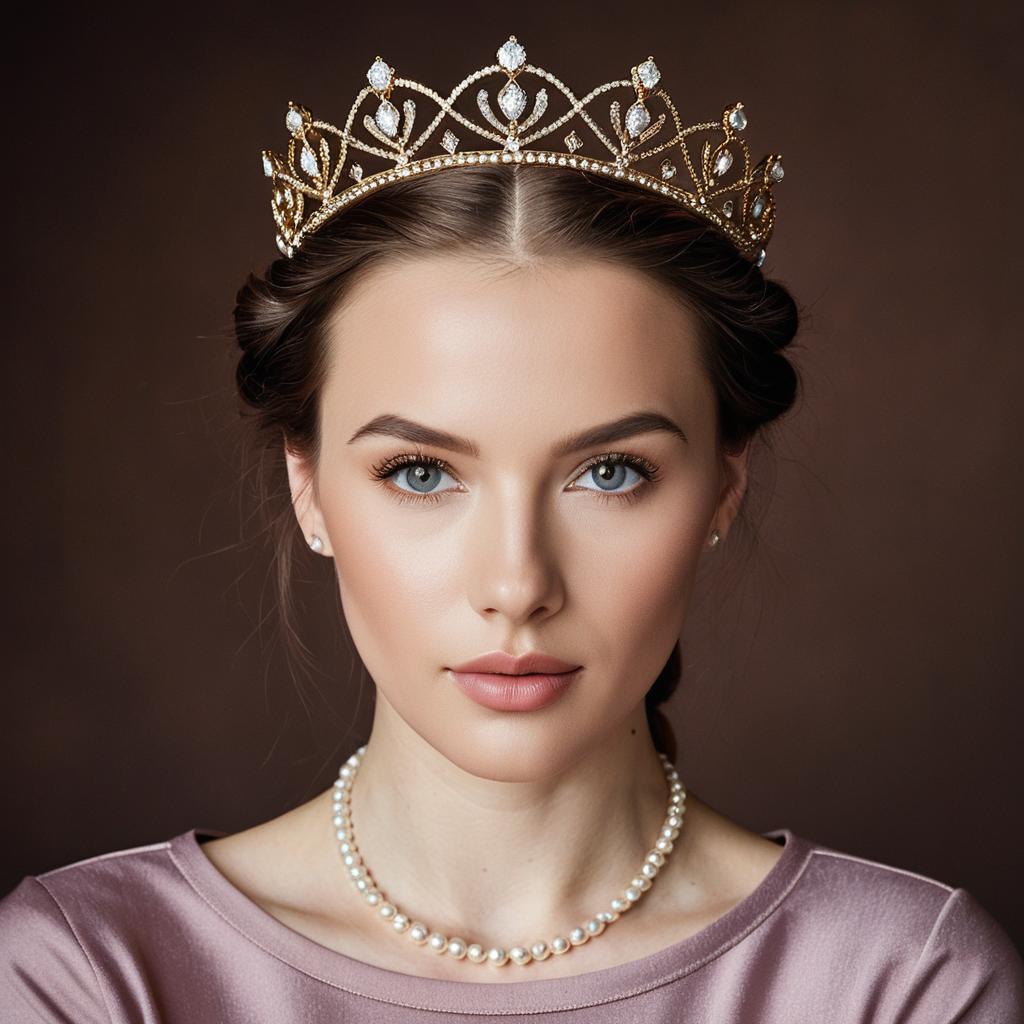 Portrait of a young fair-skinned woman with blue eyes and brown hair styled in a braided crown. She wears a gold and diamond tiara and a pearl necklace, dressed in a mauve long-sleeve top. The background is a soft brown with studio lighting, giving the image an elegant and refined appearance.