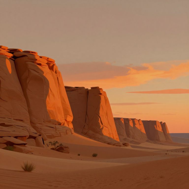 Photograph of a desert landscape at sunset, featuring tall, rugged red sandstone cliffs illuminated by warm orange and pink hues from the setting sun. The cliffs cast long shadows over the sandy, undulating terrain, which is dotted with sparse desert vegetation. The sky is mostly clear with a few scattered clouds, adding to the serene and majestic atmosphere. The image captures the rich textures and colors of the desert, highlighting the natural beauty and grandeur of the cliffs.