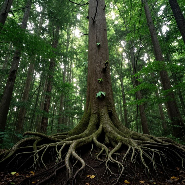 Photograph of a dense forest with a towering tree at the center. The tree's thick, textured trunk is vertical, with large, gnarled roots spreading out prominently from the base. Green leaves cover the upper branches, allowing sunlight to filter through. The forest floor is dark and covered in fallen leaves. The background shows a dense array of trees, creating a lush, green canopy. The overall mood is serene and natural, with a focus on the tree's impressive root system.