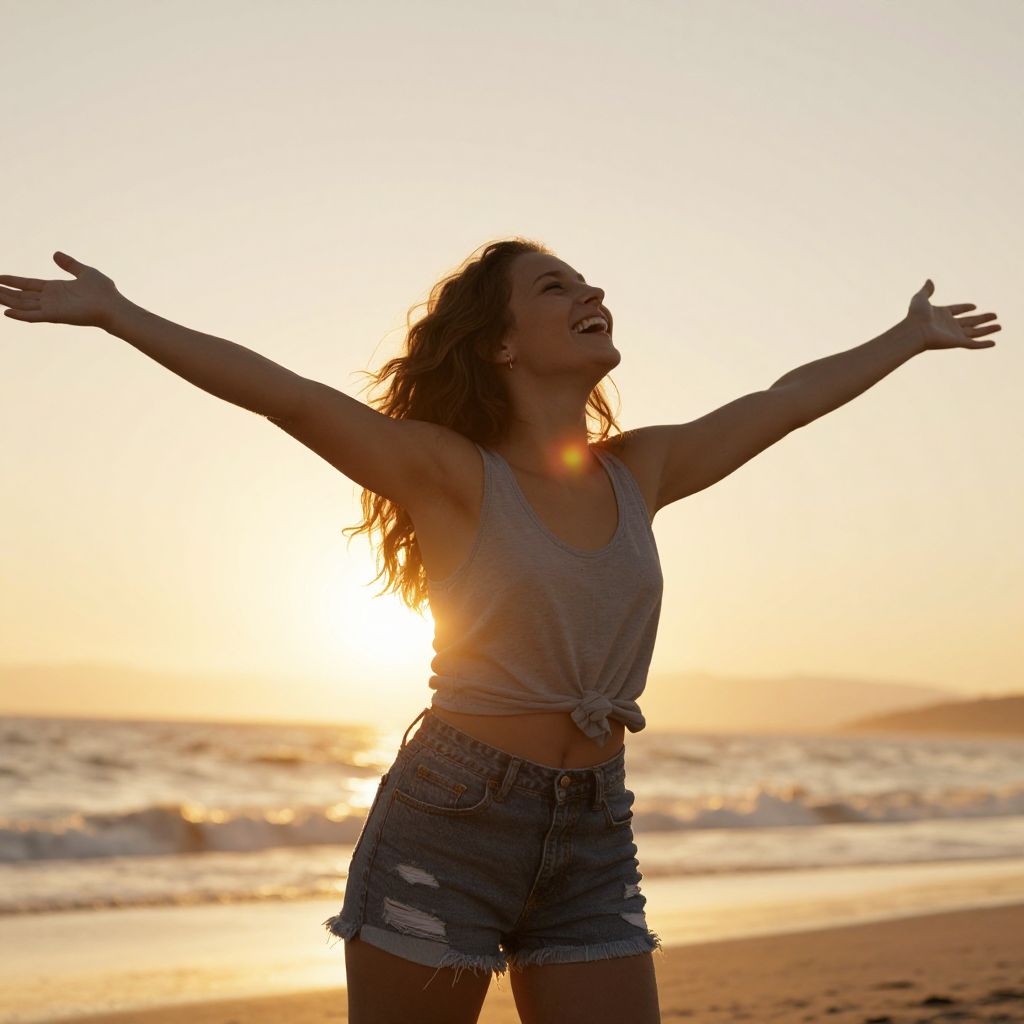 Woman embracing freedom with outstretched arms against a golden sunset at the beach, her laughter and joy radiating under the warm sunlight.