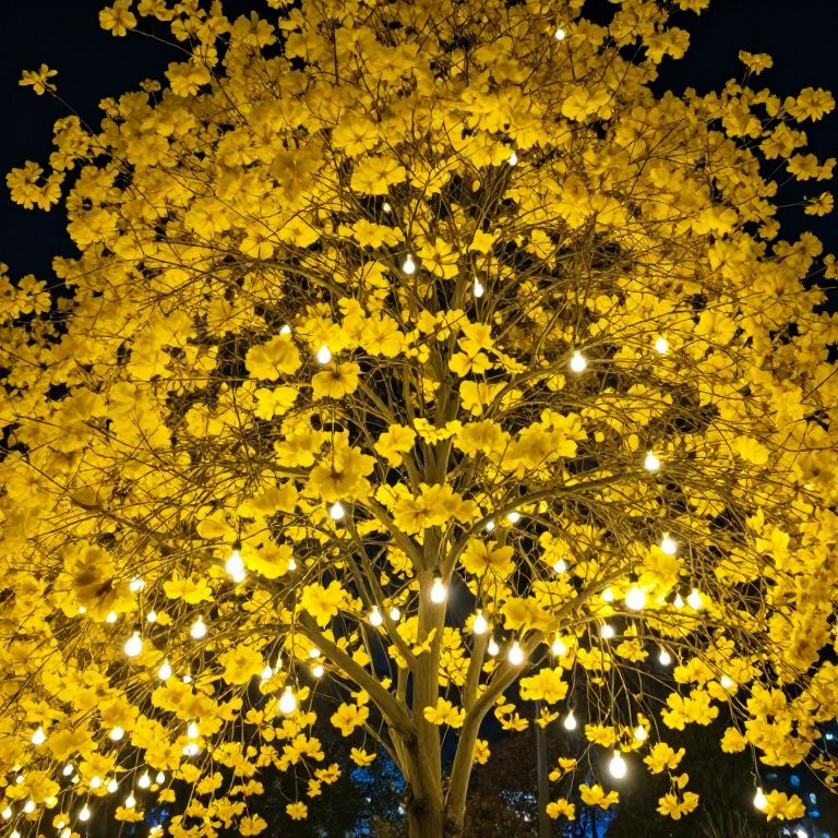 A luminous tree adorned with vibrant yellow flowers and glowing lightbulbs suspended from its branches defies convention, merging botanical beauty with electric wonder in a surreal, harmonious display.