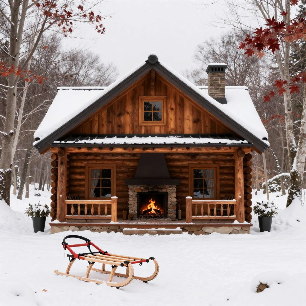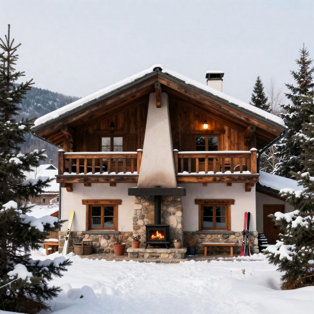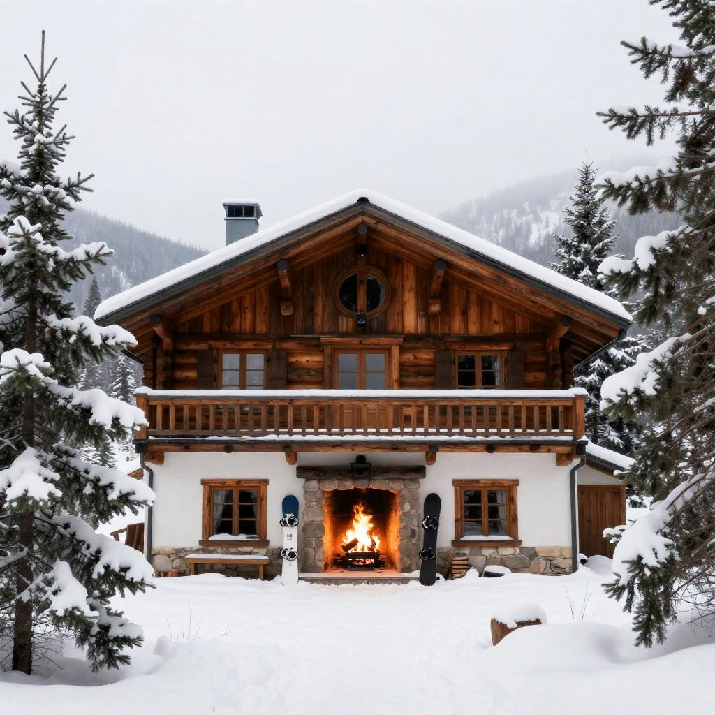 Mountain cabin in the style of Rustic Charm, in a snowy landscape surrounded by pine trees, featuring a wood-burning stove and a snowboard