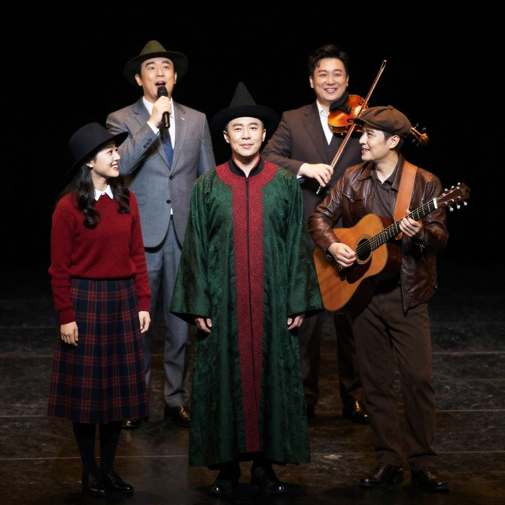 Theatrical scene with six people on stage. Central figure wears green robe with ornate red decorations, black hat. To left, woman in red sweater, dark hat, plaid skirt, smiling. To right, man in brown leather jacket, brown beret, playing guitar. Standing behind, man in gray suit, green hat, singing, another man in brown suit, playing violin, smiling. Background black, stage floor wooden. Characters interact, perform, various expressions of joy and concentration.