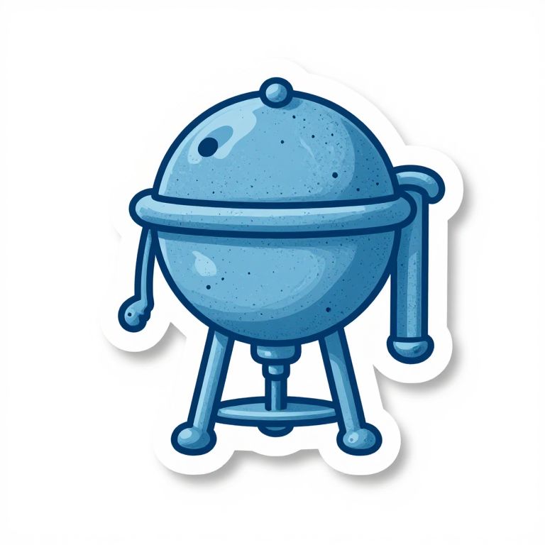 Cartoon-style digital drawing of a blue, round, lid-covered grill with two arm-like handles and three-legged stand, featuring a glossy texture and shadow