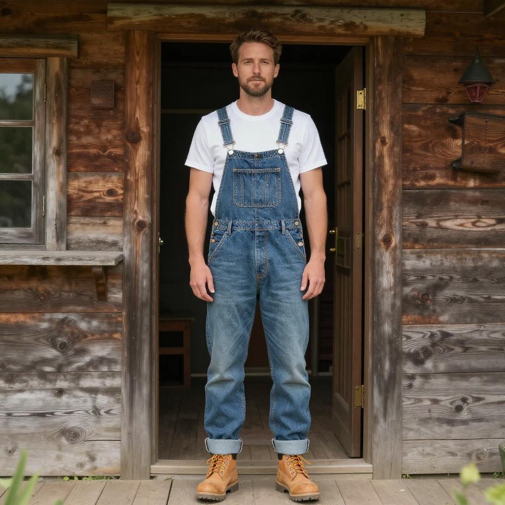 A man stands confidently in the doorway of a rustic wooden cabin, dressed in casual denim overalls paired with a plain white t-shirt and brown work boots. The natural lighting and setting highlight a rugged, outdoorsy style with modern workwear influences.