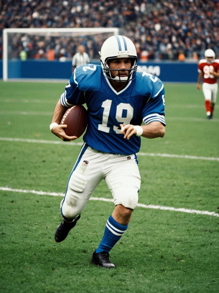 Man in Football Jersey Costume, full-body action photo on field, cinematic realism