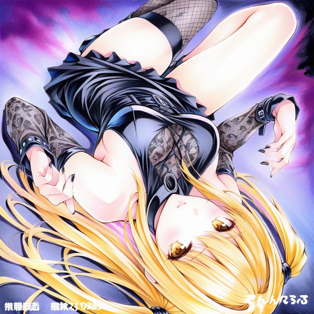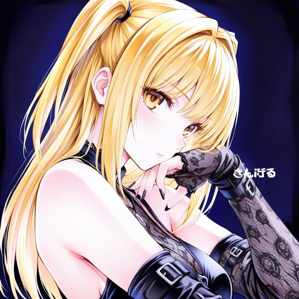 Amane misa, death note, 1girl, red eyes, blonde hair, long hair, two side up, medium breasts, black dress, bare shoulders, detached sleeves, nail polish, goth fashion, goth fashion, by artist yqgkg, illustrious