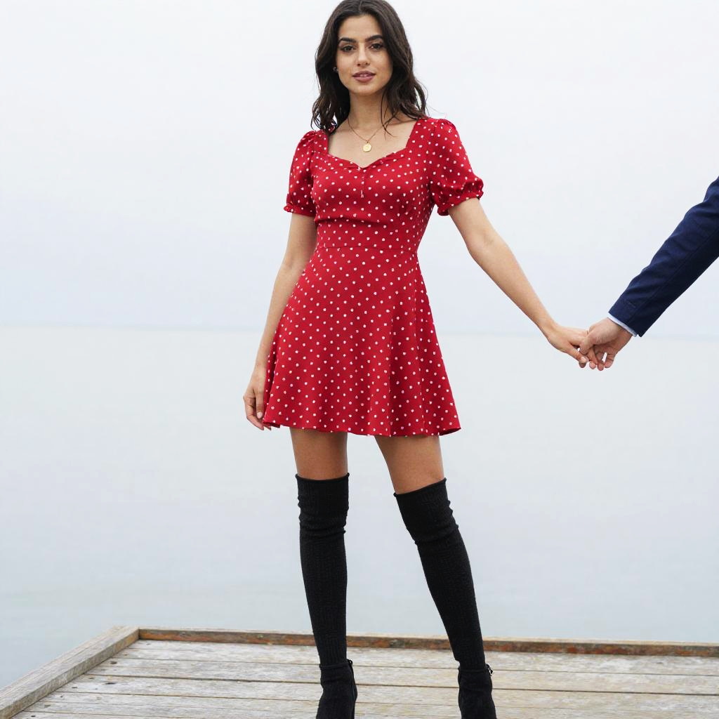 A Svelte woman, casual chic in a short red flared dress with white polka dots, scoop neckline, and short sleeves, paired with black thigh-high textured socks and ankle boots, adorned with a delicate gold pendant necklace, standing on a pier with a couple holding hands, in the visual style of Antarctic Press. Sexy. Pretty face and beutiful eyes