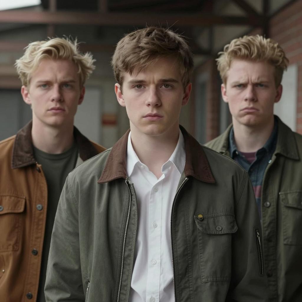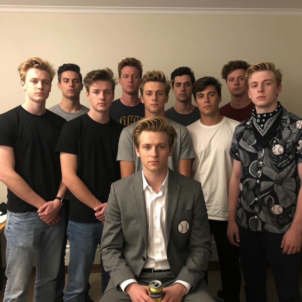 Photograph of ten young men in a room. Central man with gray suit, baseball patch, and white shirt sits, holding a beer can. Nine men stand behind, varying casual attire, neutral expressions. Background: plain walls, muted colors. Casual, slightly disheveled hairstyles. Rightmost man in patterned shirt with bandana. Light, even indoor lighting.