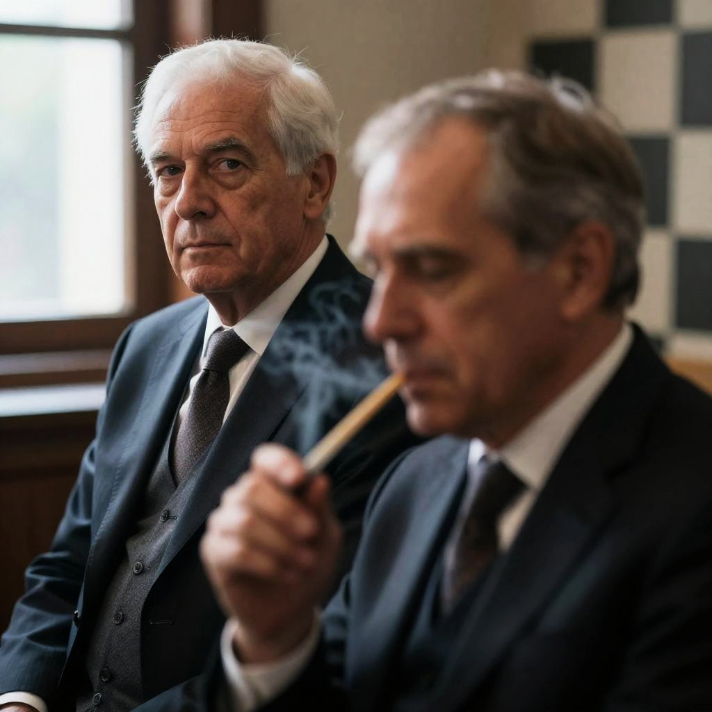 Black-and-white photograph of two men in a dimly lit room. The man on the left has short, light-colored hair, wears a dark jacket over a white shirt, and looks intently at the man on the right. The man on the right has slightly longer, dark hair, wears a dark suit with a tie, and smiles while looking at the other man. Background includes blurred shelves and light sources.