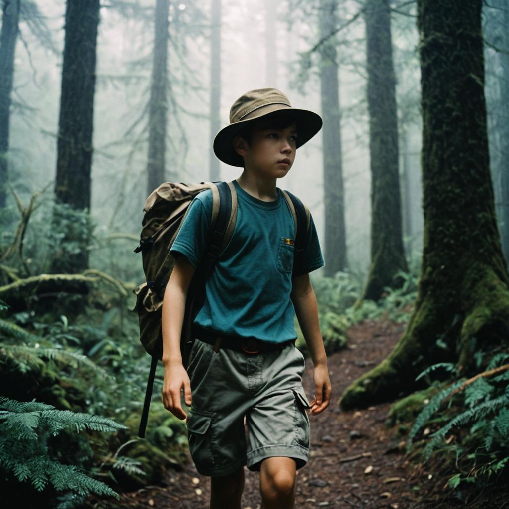 Kodak Portra cinematic film still of a boy with an adventurous spirit, wearing a ranger hat and cargo shorts, hiking through a dense, misty forest, moody and atmospheric vibe.
