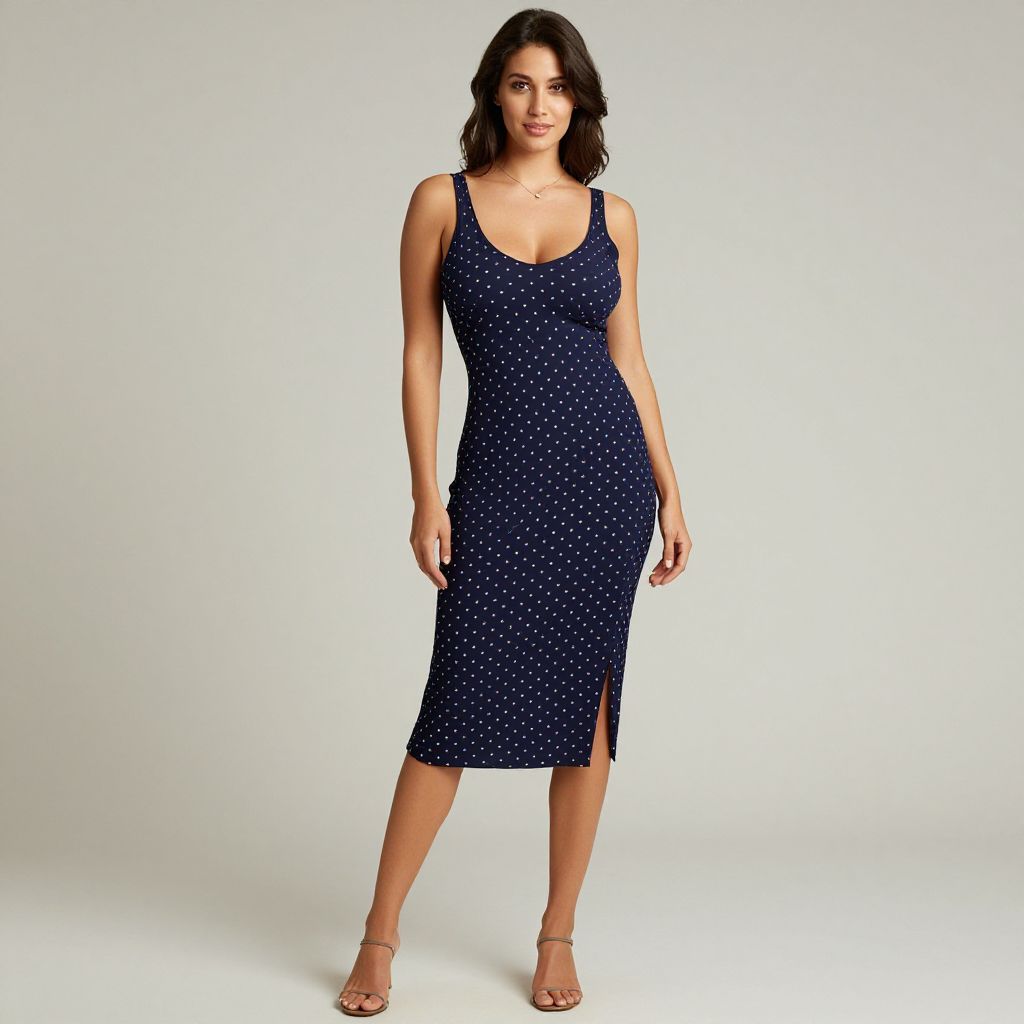 Woman, casual chic, navy-blue polka dot slip dress, scoop neck, sleeveless, knee-length with a slight asymmetrical cut at the hem, simple thin-strap sandals, minimal jewelry, studio background with soft lighting.. Sexy. Pretty face and beаutiful eyes. Big breasts.