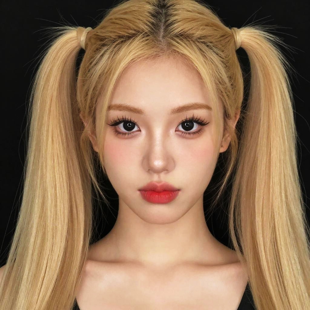 (8k, 4k, best quality, highres, ultra high res:1.1), (masterpiece, realistic, photo-realistic:1.1), 1girl, face, close-up, twintails, blonde hair, black eyes, red lips, (looking at viewer:1.5), absurdly long hair, long eyelashes, eyeshadow, small face, big eyes, bare shoulders, high contrast