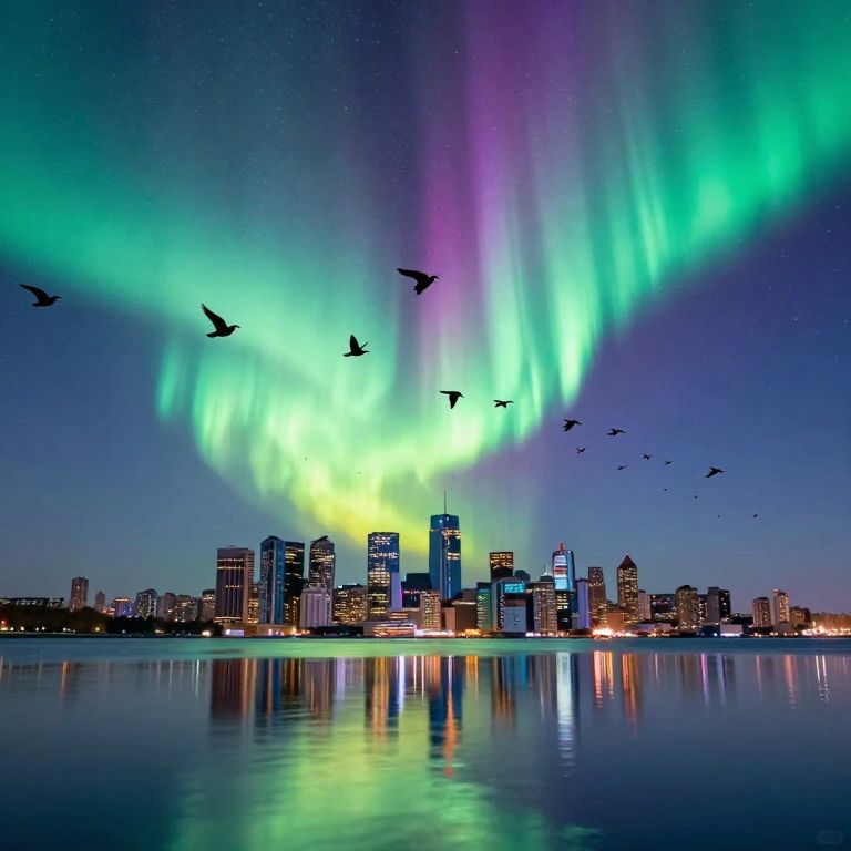 Photograph of a city skyline at night with vibrant green, purple, and yellow aurora borealis lights illuminating the sky. Silhouetted birds fly across the luminous sky. The city's skyscrapers reflect brightly on a calm, mirror-like water surface below. Buildings are varied in height and design, with lights glowing from windows. The overall scene combines natural beauty with urban architecture, creating a stunning, colorful nighttime vista.