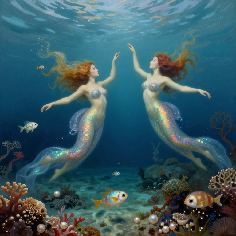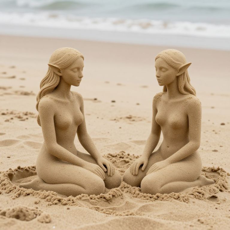 Photograph of two detailed, realistic sand sculptures of nude, elf-like women with pointed ears, kneeling on a sandy beach. Both figures have long, wavy blonde hair, small to medium-sized breasts, and are covered in fine sand, blending with the beach. They are positioned facing each other, with serene expressions. The background features a blurred, calm ocean with gentle waves. The sand texture is smooth, and the overall color palette is natural, featuring sandy beige and soft blue hues. The image evokes a tranquil, fantasy-like atmosphere.