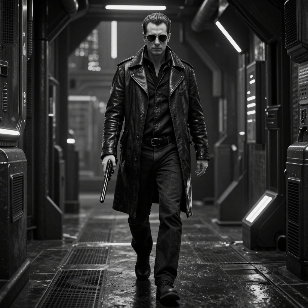 A highly detailed, ultra-realistic black and white photograph of a futuristic, dystopian cityscape featuring a man in a leather coat and sunglasses, holding a gun, walking through a dark, metallic corridor with glowing lights.
