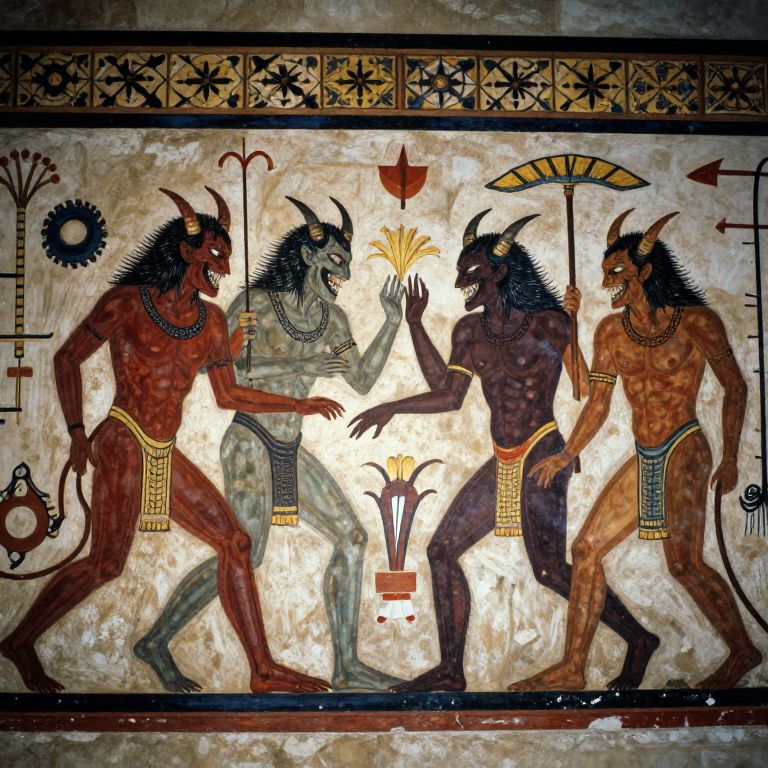 Ancient Egyptian mural of four muscular, horned, dark-skinned male figures in loincloths, adorned with jewelry, interacting around a central