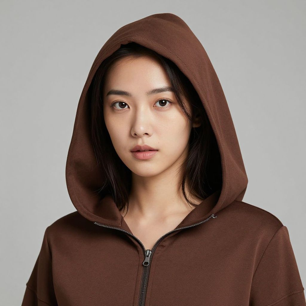 Marcel Shell Costume, a close up of a woman wearing a brown outfit with a hood