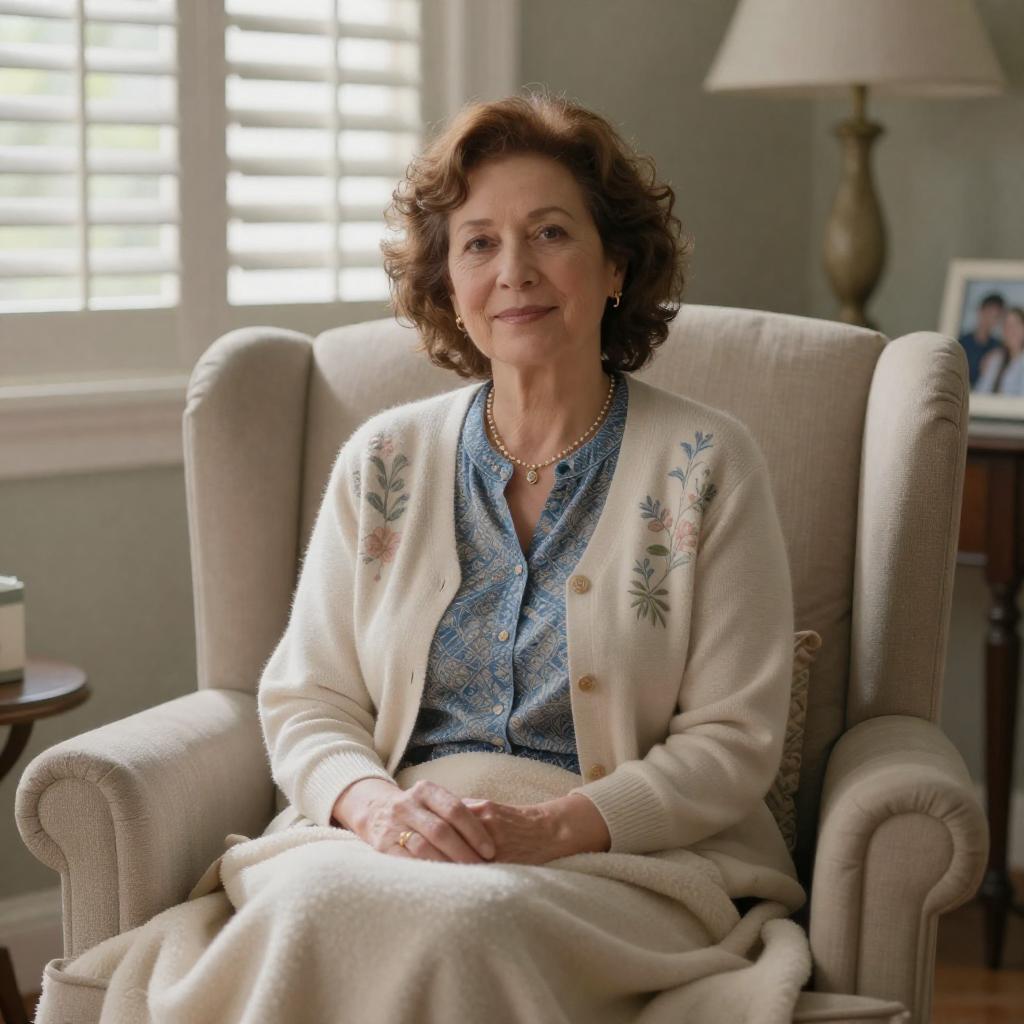 Middle-aged woman with curly brown hair, wearing a blue patterned blouse and beige cardigan with floral embroidery, sitting in a beige armchair, holding a beige blanket. Background includes a window with white shutters, a lamp, a photograph of two people, and a small table. Woman's expression is calm and slightly smiling. Light, cozy indoor setting.