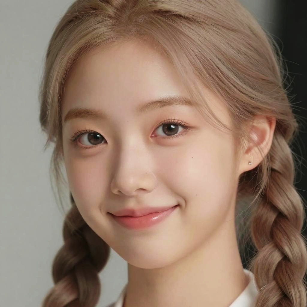 8k, best quality, masterpiece, realistic, ultra detail, photography, HDR, ROW photo, highres, absurdres, cinematic light, official art, High-definition, depth of field, (close-up:1.4), slender, cute face, smile, beautiful details eyes, 19years old korean, pretty, Side braid with ash blonde color, (detail skin:1.6)