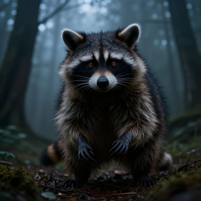 Deformed raccoon with exaggerated features and twisted limbs, eerie glowing eyes, set in a misty forest at twilight, detailed fur texture, haunting atmosphere, blending realism with dark fantasy style.