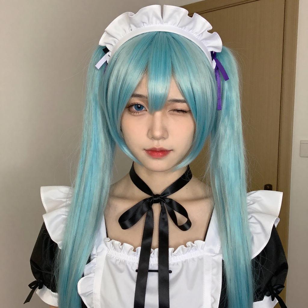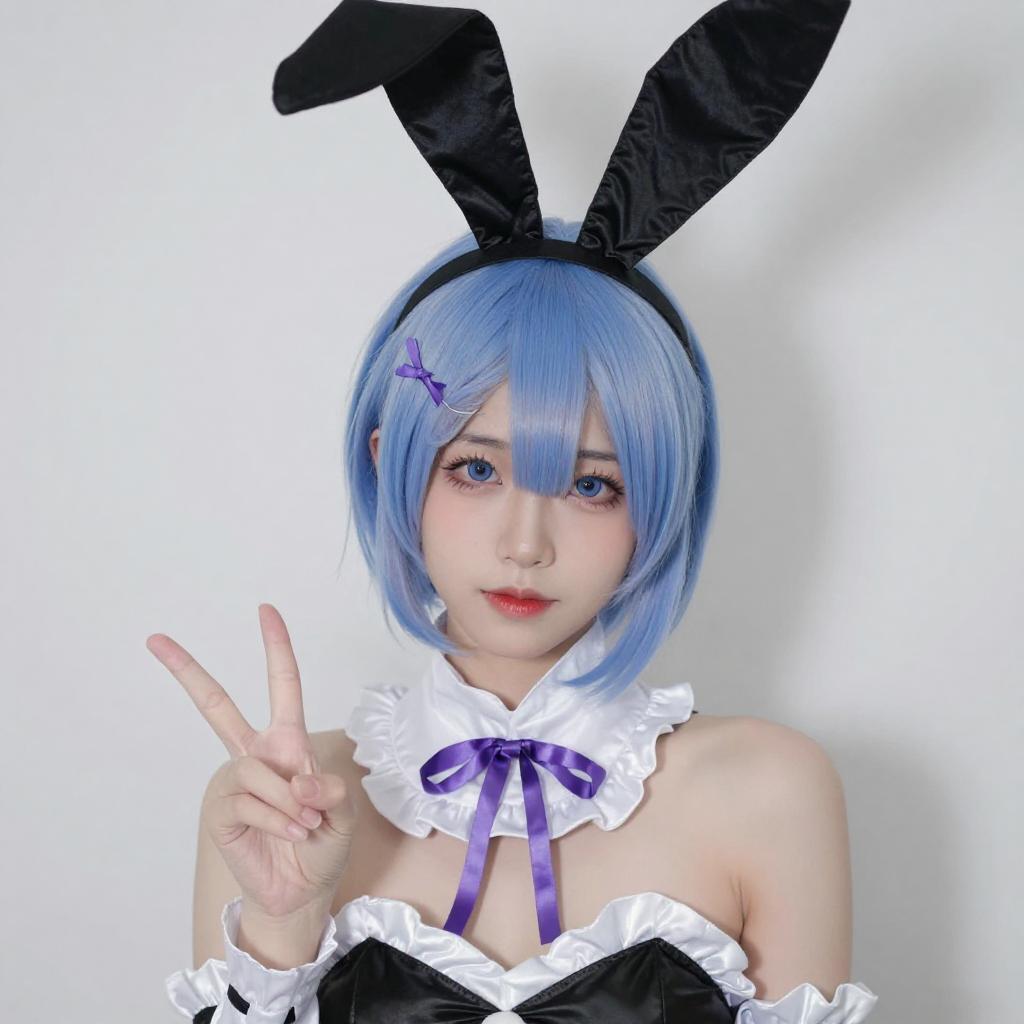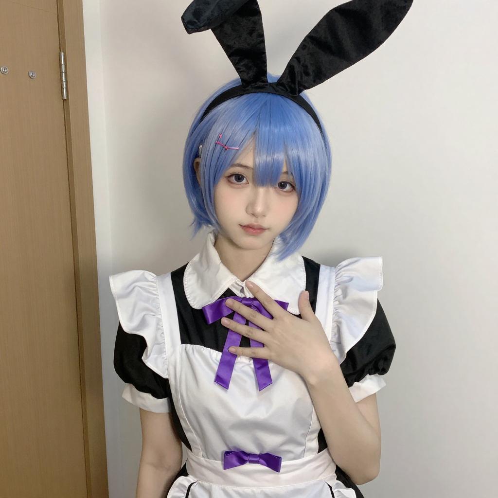 Photograph of a young person with light skin and blue hair, wearing a black and white maid outfit with purple ribbons and black bunny ears. They have a hand covering their chest, with a shy expression. The background is a plain white wall with a wooden door on the left.