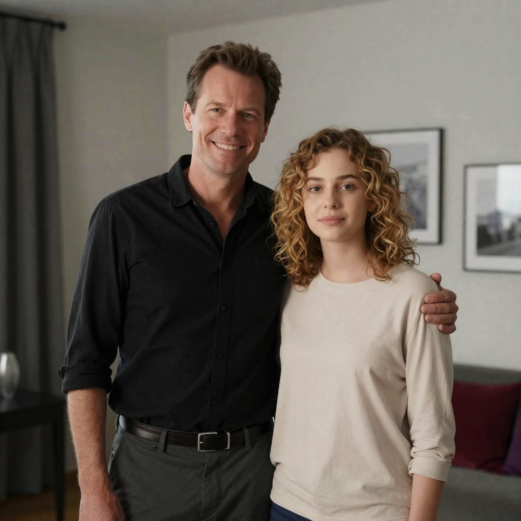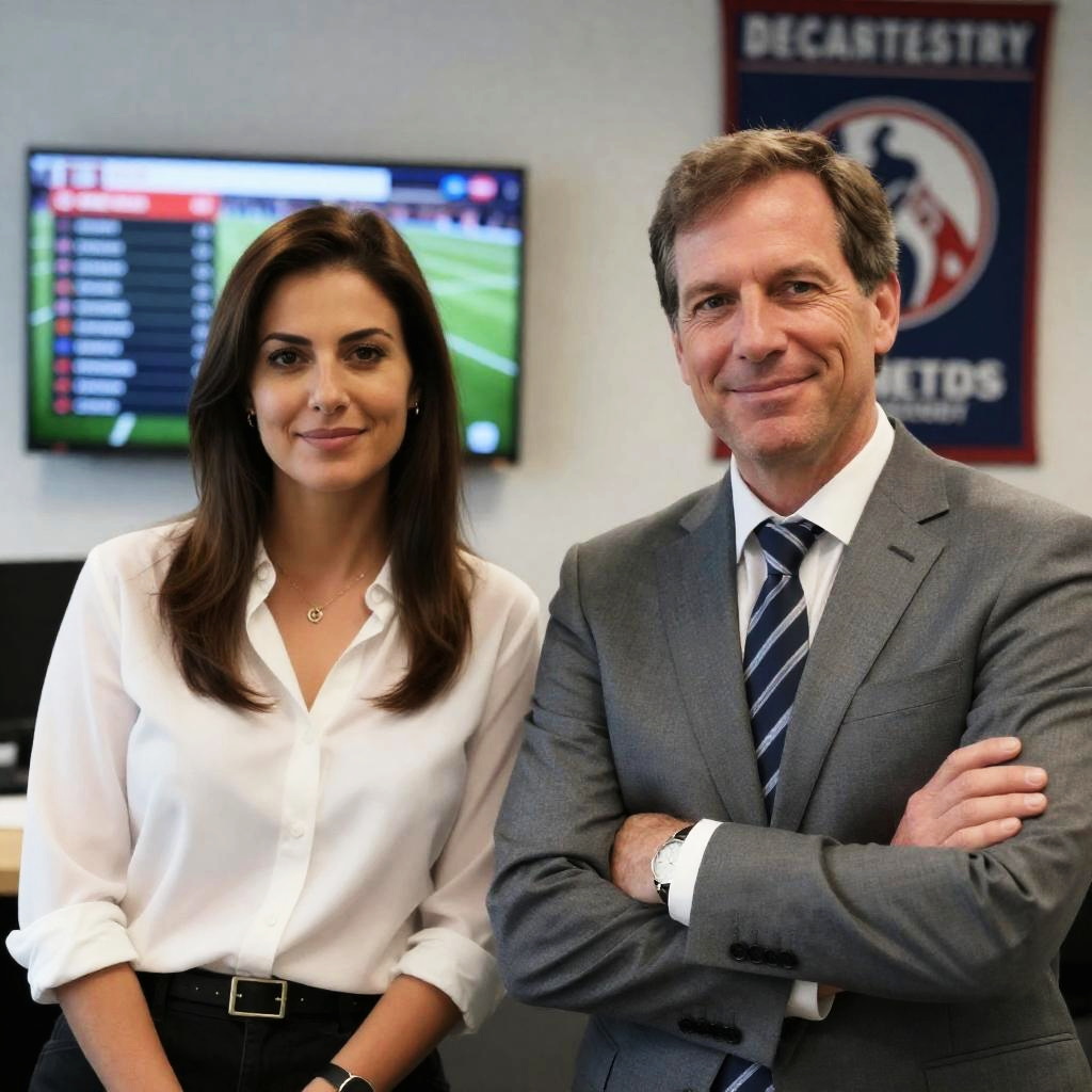 Photograph of a middle-aged man and woman sitting with arms crossed. Man in gray suit, white shirt, striped tie, short brown hair, slight smile. Woman in white blouse, long brown hair, subtle smile. Flat-screen TV in background, sports schedule visible. Sports banner on wall. Casual office setting.