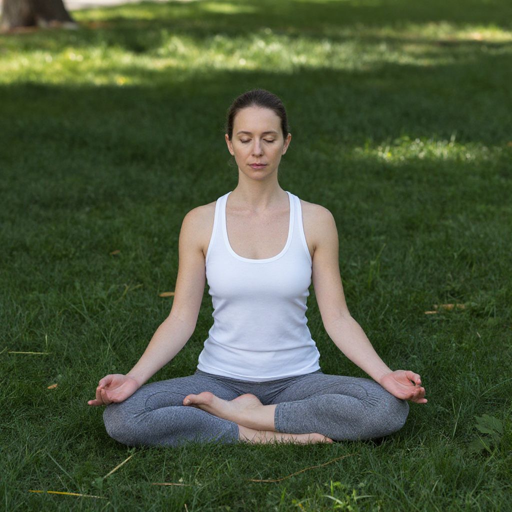 Photograph of a fair-skinned woman with dark hair in a white tank top and gray leggings, sitting cross-legged in meditation on lush green grass.