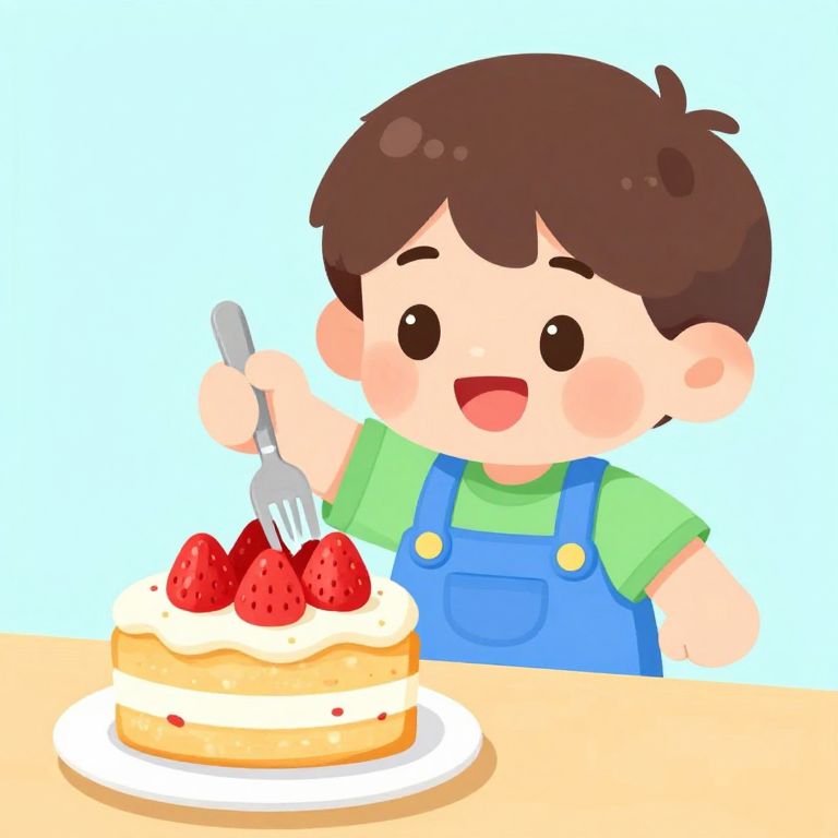 Boy gleefully holding a fork while leaning over a plate with a two-tiered strawberry-topped cake, his brown hair styled in a playful spike, wearing a green shirt and blue overalls.