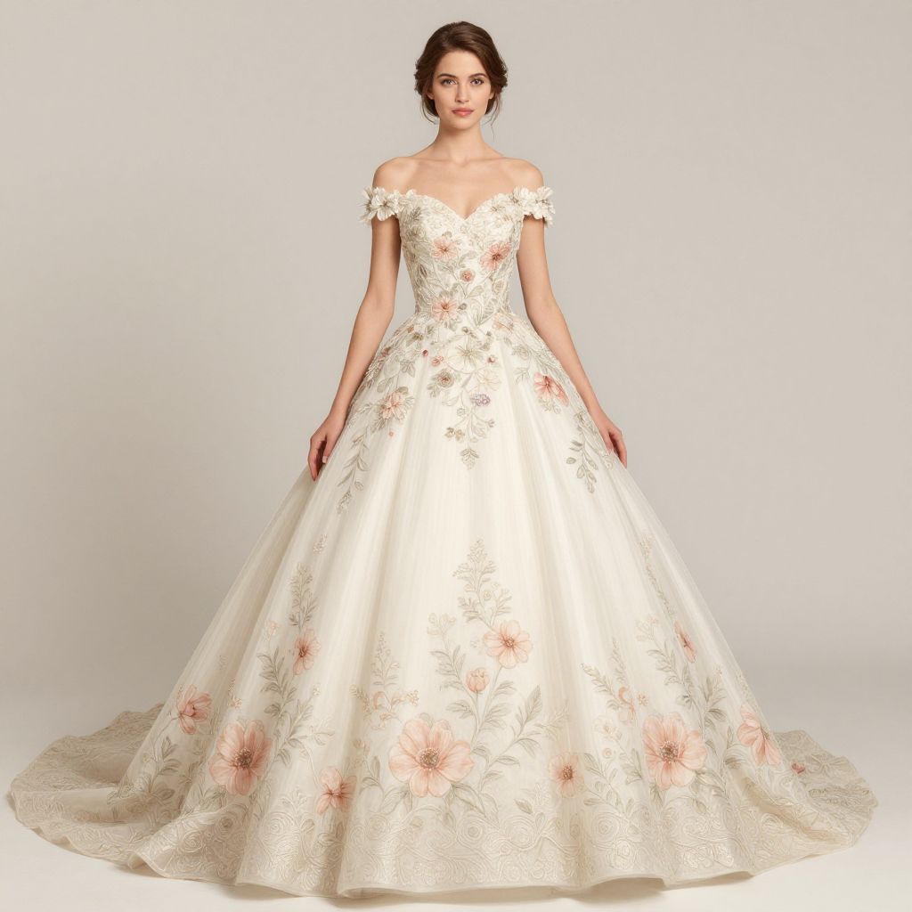 This stunning illustration features a woman elegantly dressed in a floral gown with intricate detailing. The composition highlights the grandeur and sophistication of bridal fashion in a soft color palette, merging realism with artistry.