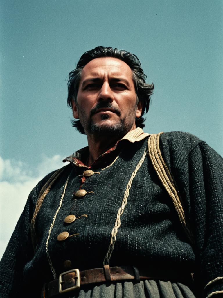 Man in Peasant Clothing, cinematic realism, dramatic low-angle portrait