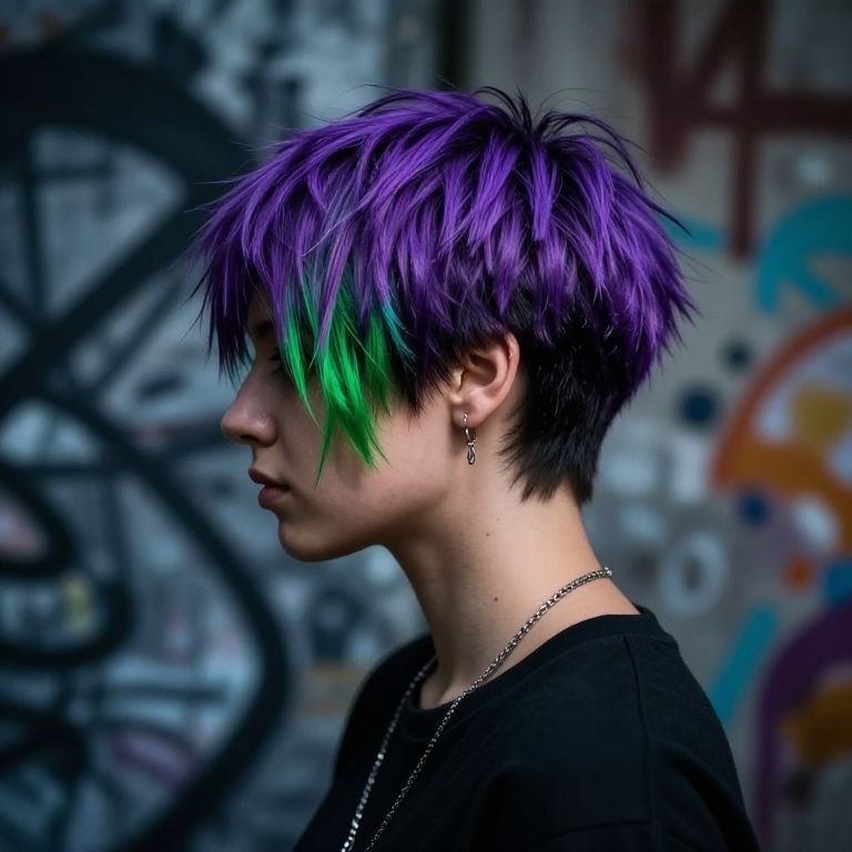 Purple and green short hair styled in an edgy pixie cut, urban street style outfit, graffiti wall backdrop, dramatic shadows, high detail, focus on hairstyle texture, cool moody ambiance, street fashion photography vibe