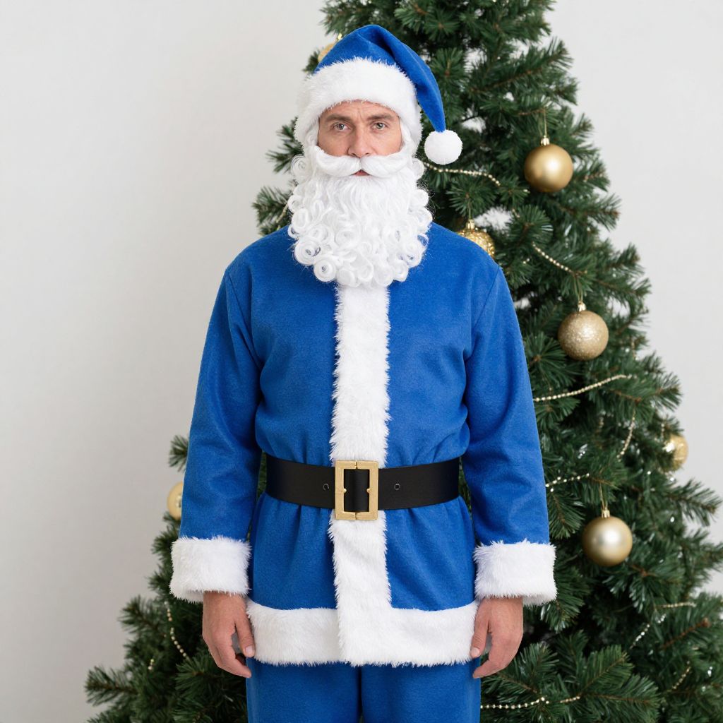Photograph of a man dressed as Santa Claus standing in front of a decorated Christmas tree. He wears a bright blue velvet suit with white fur trim, a black belt with a gold buckle, and a matching blue Santa hat with a white pom-pom. His long, white, curly beard and mustache contrast with his light skin. The Christmas tree behind him is adorned with golden baubles and white string lights, set against a plain white background. The man's expression is neutral, and he stands with his arms at his sides.