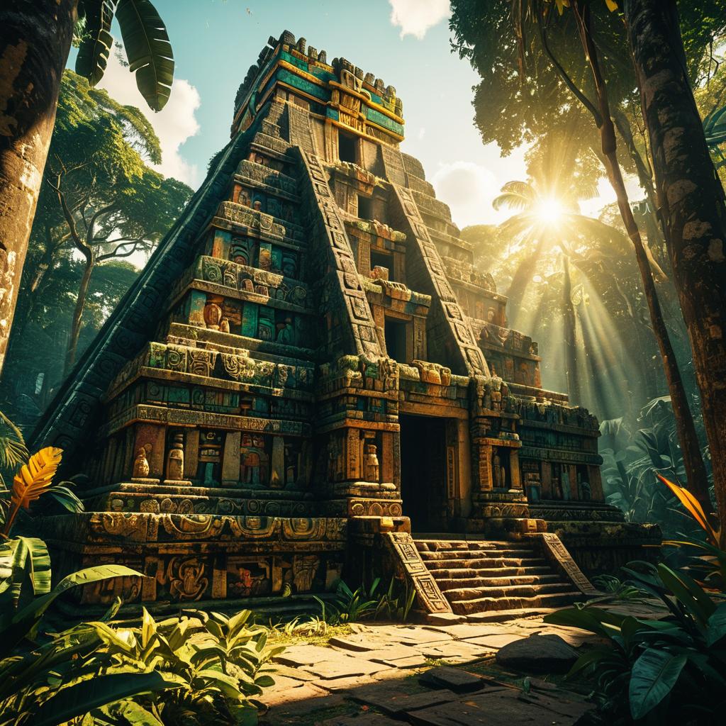 Multi-dimensional illustration featuring an ancient Mayan jungle temple drenched in golden sunlight, painted in the style of Frederick Catherwood, Charlesvirtió Zeitraum Mendes, Paul Gauguin, dreamy, colorful vanilla oil, 3D relief, super wide angle, 4K, romantic, trending on ArtStation